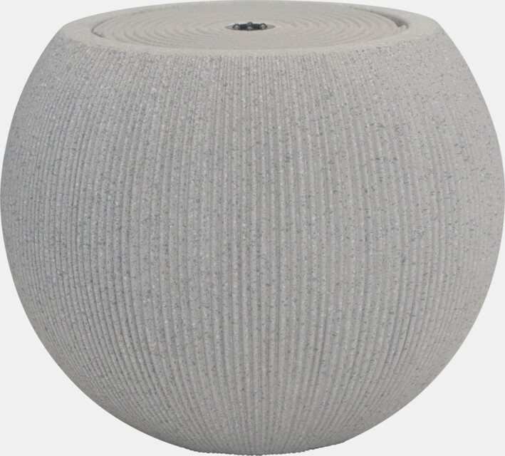 Dimensions : 37 x 37 x 30 cm, forme sphérique nervurée beige. Équipé d'une pompe de 250 litres par heure et d'un éclairage LED de 5 W.
